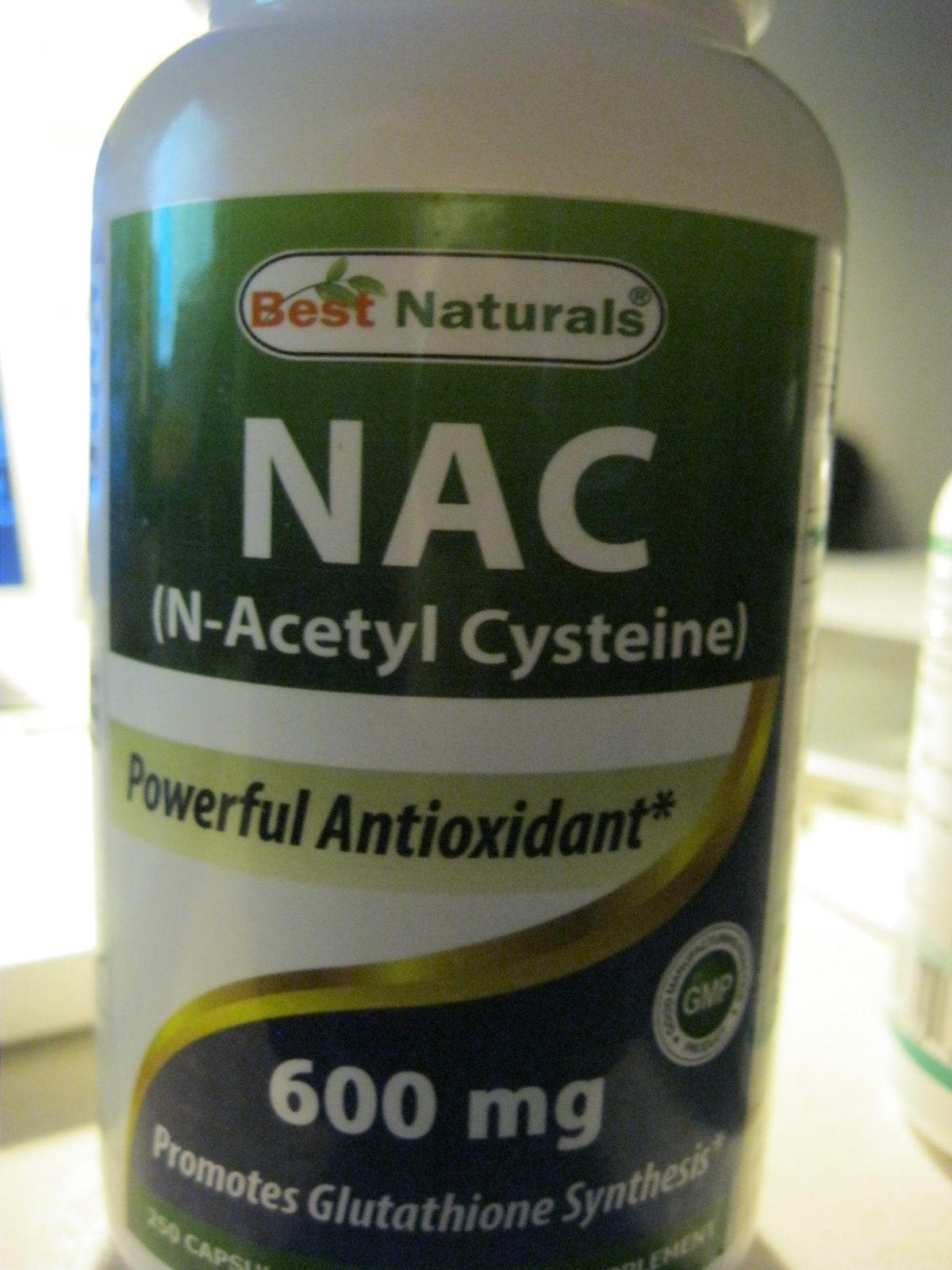 From the side of its bottle: “N-Acetyl Cysteine (NAC) is a stable form of the non-essential amino acid L-Cysteine. It is a sulfur-containing amino acid that acts as a stabilizer for the formation of protein structures, and is alos necessar for the formation of Glutathione which exerts a variety of protective effects, including detoxification and intracellular defense against oxidative stress.”